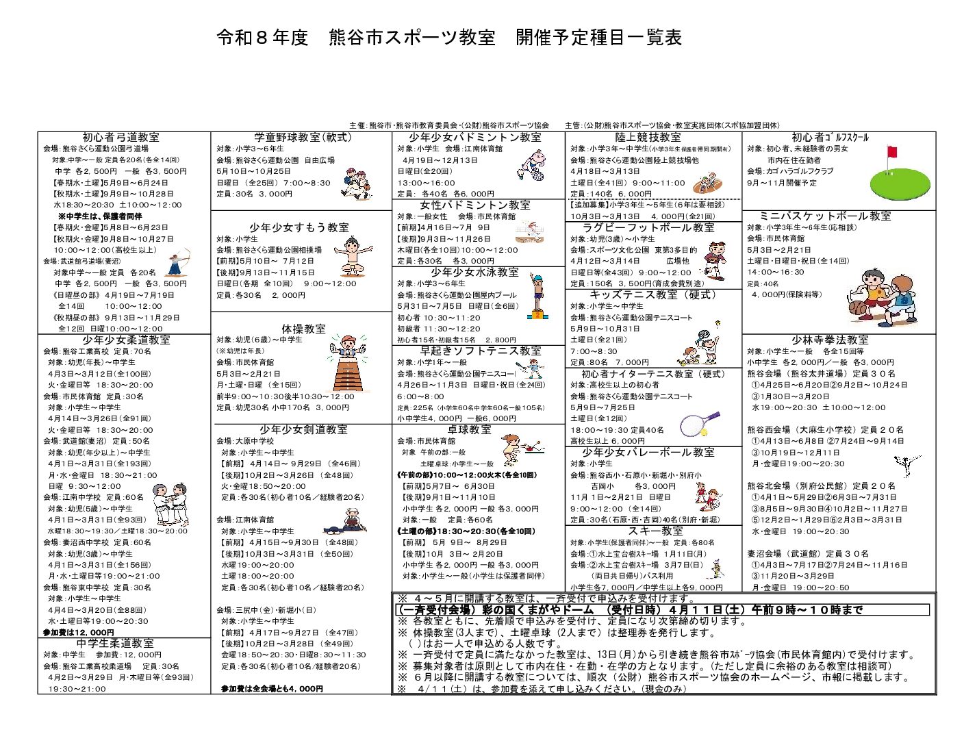 令和8年度 スポーツ教室 開催一覧表 更新日:2026年02月16日 令和8年度 熊谷市スポーツ教室 開催予定種目一覧表 ※剣道(武道館めぬま)教室は、令和8年度教室はなくなりました。 新しい記事へ 一覧で見る 古い記事へ