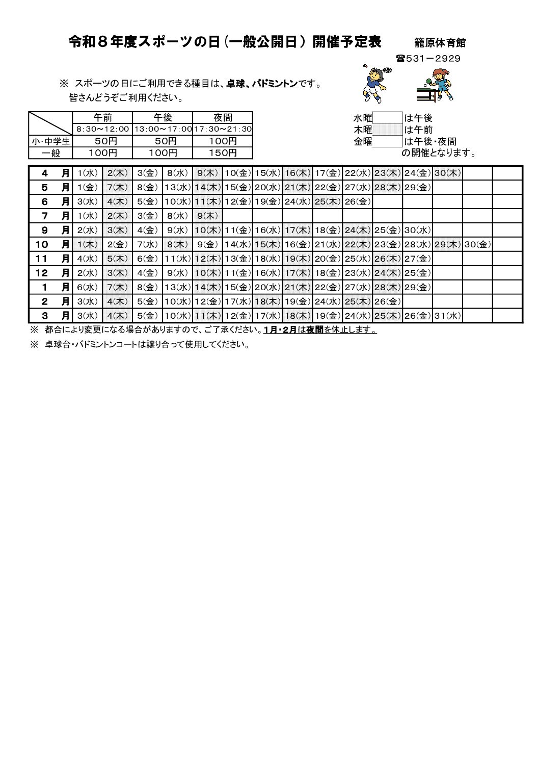 ※スポーツの日にご利用できる種目は、卓球、バドミントンです。
